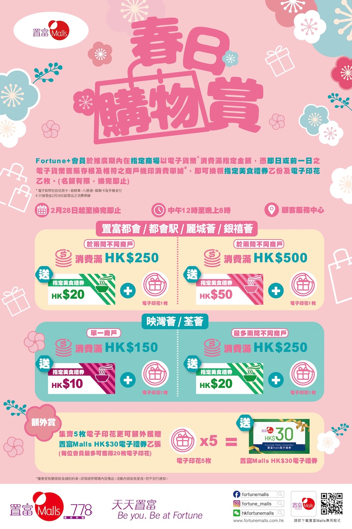 春天是獎賞盛放的季節,置富Malls今年將消費驚喜全面升級,除了聯乘人氣日本插畫角色 SHO-CHAN燦子及燦氏家族,呈獻【置富Malls x SHO-CHAN置「燦」你迎新春】,還推出「春日購物賞」,以美食禮券為主打,讓大家盡情享受春日滋味,Fortune+會員由2月28日起在置富Malls消費滿指定金額,即可即時換領美食禮券及電子印花,集齊5枚電子印花更可額外獲贈置富Malls電子禮券。獎賞橫跨多個商場,涵蓋各式各樣食肆,無論是想與親友共享團圓盛宴,還是隨心品嚐春日小食,都能找到合適的優惠,讓每次消費都能解鎖更多的美食驚喜!
