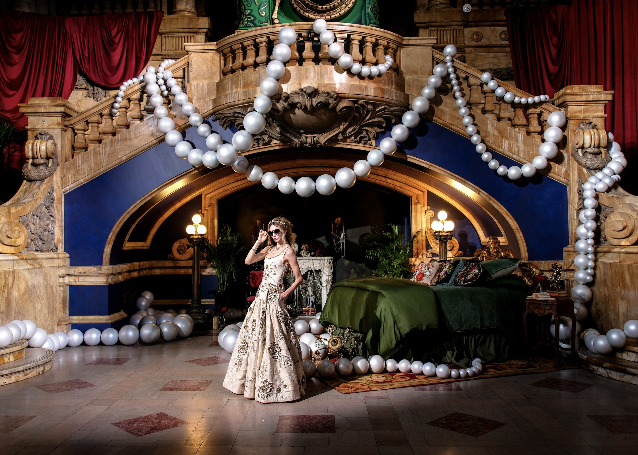 The Beaux-Arts architecture of the venue provides a fitting backdrop for a series of immersive vignettes that act as a living tableau of the Gilded Age’s excess and evolution. Upon entering the main hall, guests encounter a grand staircase draped with a larger-than-life pearl necklace and an ornate turn-of-the-century camera overlooking a gilded bedroom. A towering 20-foot gown doubles as a theater curtain. Nearby, an installation of eight-foot-tall crystal-encrusted books, including Mark Twain’s The Gilded Age, set a literary mood, while an antique automobile, clock and luggage evoke the era’s spirit of exploration and travel.