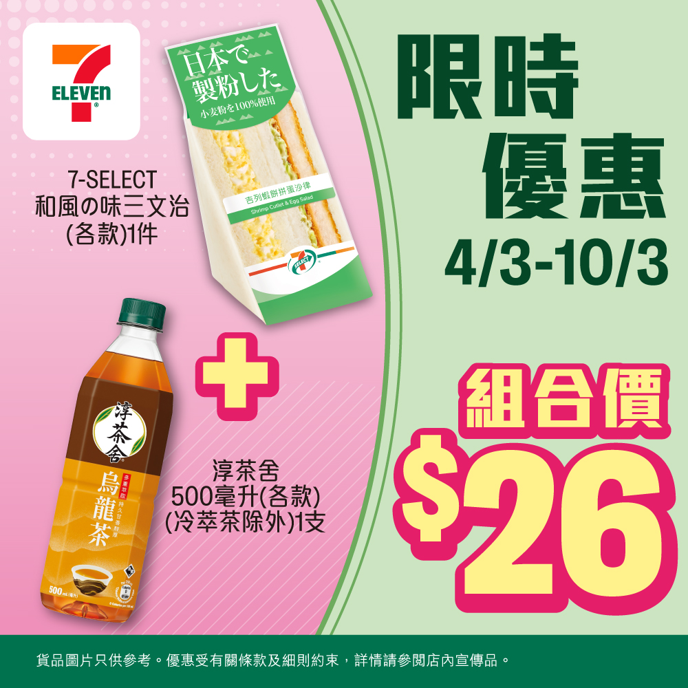 限時優惠組合啦!*優惠有效期由2026年3月4日早上7時至3月10日。每宗交易只限以優惠換購飲品1件。部份貨品只限於指定店舖提供。貨品數量有限,售/送/換完即止。不可與其他優惠同時使用。如有爭議,所有價格以個別店舖為準。貨品圖片只供參考。優惠受條款及細則約束,詳情請參閱店內宣傳品。