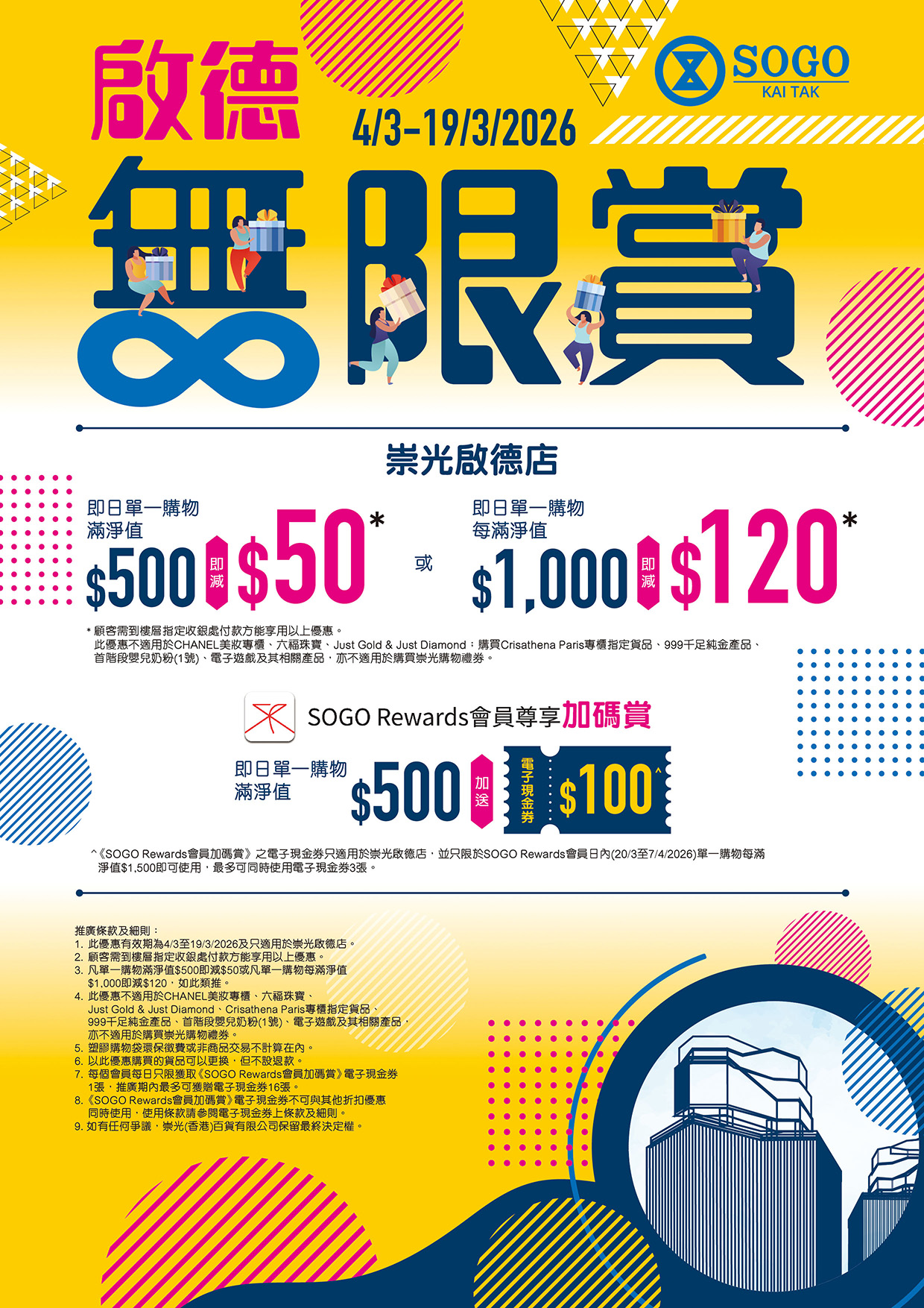 「啟德無限賞」活動期間,顧客凡於崇光啟德店即日單一購物滿淨值$500,即減$50;每滿淨值$1,000即減$120,如此類推。優惠以單一發票計算,且不設減免上限,買得越多,優惠越大!顧客只需於樓層指定收銀處付款,便可享即時帳單扣減,毋須等待。