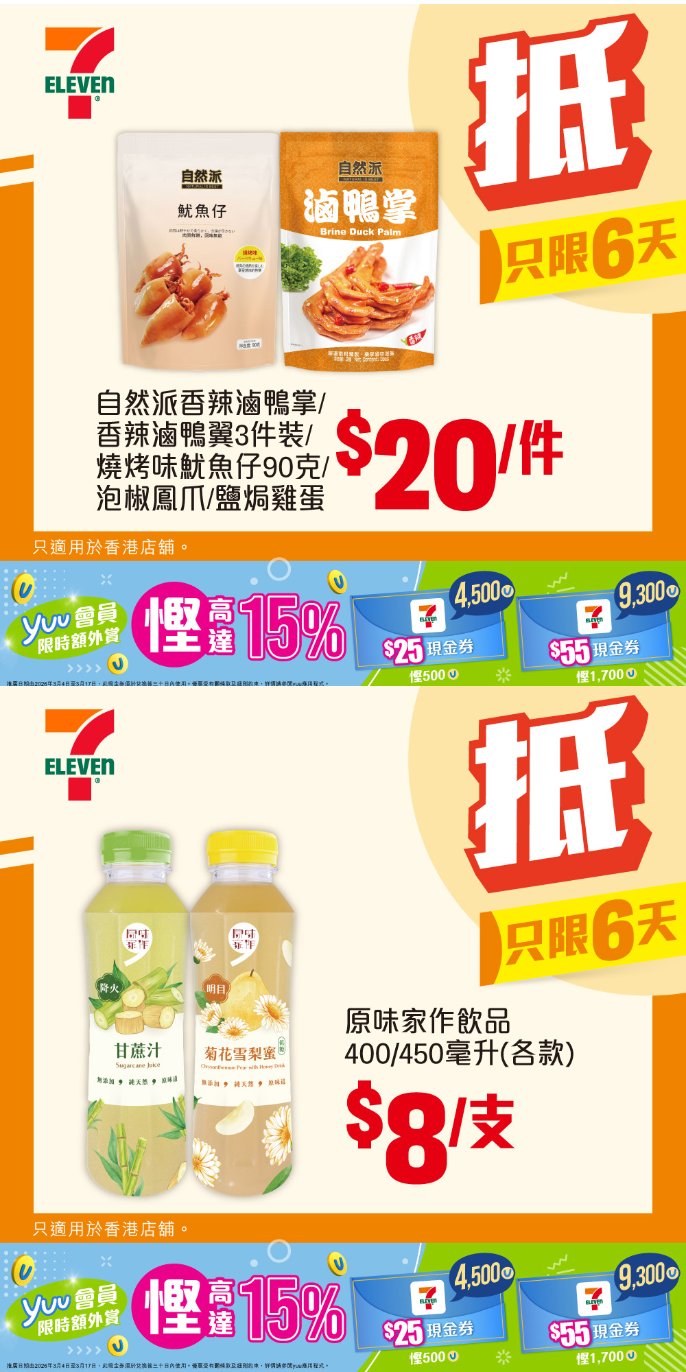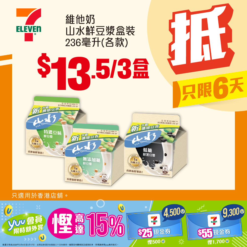 yuu會員限時優惠嚟啦!由即日起至3月17日,yuu會員只需以4,500yuu積分,即可兌換7-Eleven電子現金券$25^,額外慳10%;或者以9,300積分兌換7-Eleven電子現金券$55^,更可慳高達15%!宜家入yuu app兌換現金券,到7-Eleven挑選心水產品,賺盡著數,實行積分當錢使啦! * 優惠有效期由2026年3月12日早上7時至3月17日。優惠只適用於香港店舖。部分貨品只限於指定店舖提供。貨品數量有限,售完即止。如有爭議,所有價格以個別店舖為準。貨品圖片只供參考。就一切有關事宜,7-Eleven將保留最終之決定權。