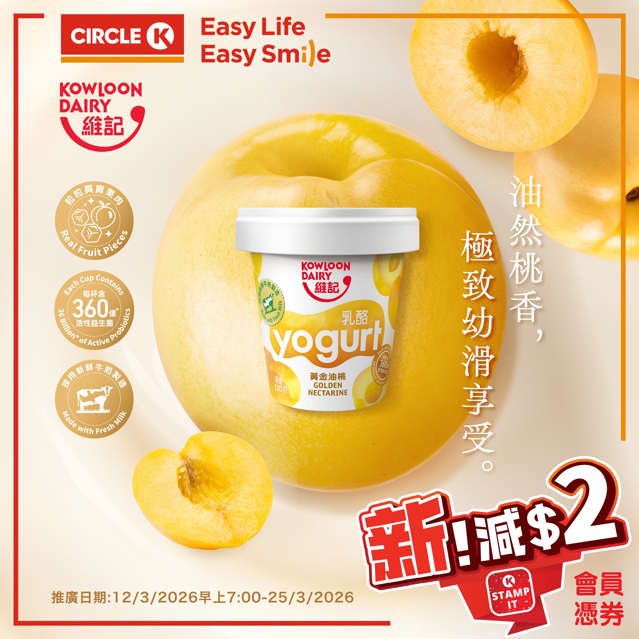 #OK便利店#CircleK#新品#維記牛奶#鮮牛奶製造#新登場#乳酪#鮮乳酪#杯裝乳酪#360億益生菌#活性益生菌#腸道健康#快酪腸胃#黃金油桃