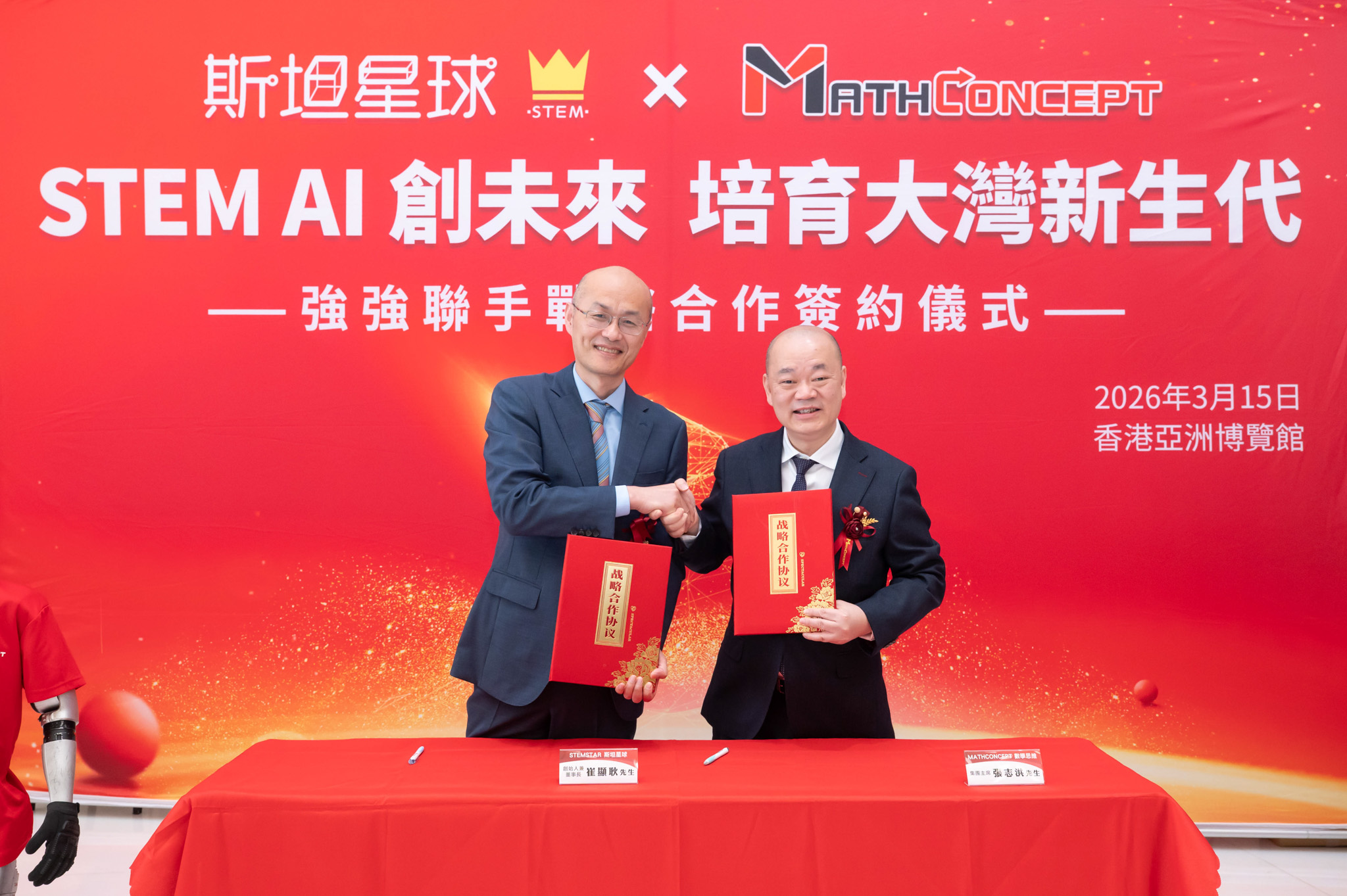 比賽當天,MathConcept與內地卓越科技教育品牌斯坦星球進行了戰略合作簽約儀式,由MathConcept Education集團主席,及STEMSTAR創始人及董事長簽署。斯坦星球專為 3-18歲青少年設計多元、整合式 STEM AI 課程。集團相信憑藉兩大品牌強強聯手,合作開辦STEM AI 課程,將能夠吸引並且幫助學生理解人工智能原理,真正達到學以致用。