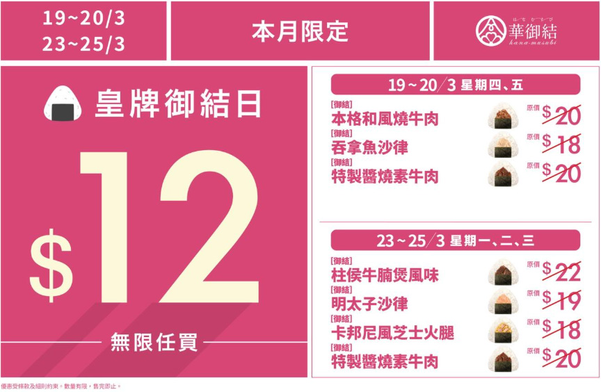 華御結$12「皇牌御結日」於3月19日至25日(星期六及日除外)再次回歸,一連5日為御結迷帶來人氣定番及新品超值之選!精選款式包括[御結]本格和風燒牛肉(原價 $20)、 [御結] 吞拿魚沙律(原價 $18)、[御結] 特製醬燒素牛肉(原價 $20)、[御結] 明太子沙律(原價 $19)、[御結]卡邦尼風芝士火腿(原價$18)及首次加入優惠,並好評如潮的 [御結]柱侯牛腩煲風味(原價 $22)。口味多樣化,總有至啱口味!數量有限,售完即止。