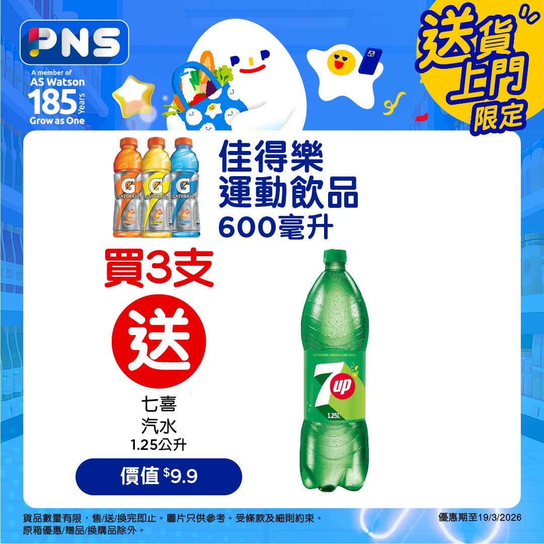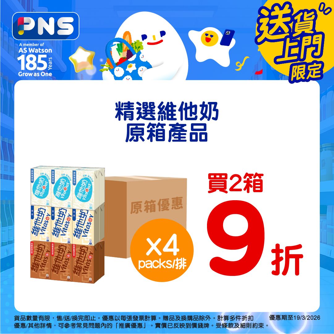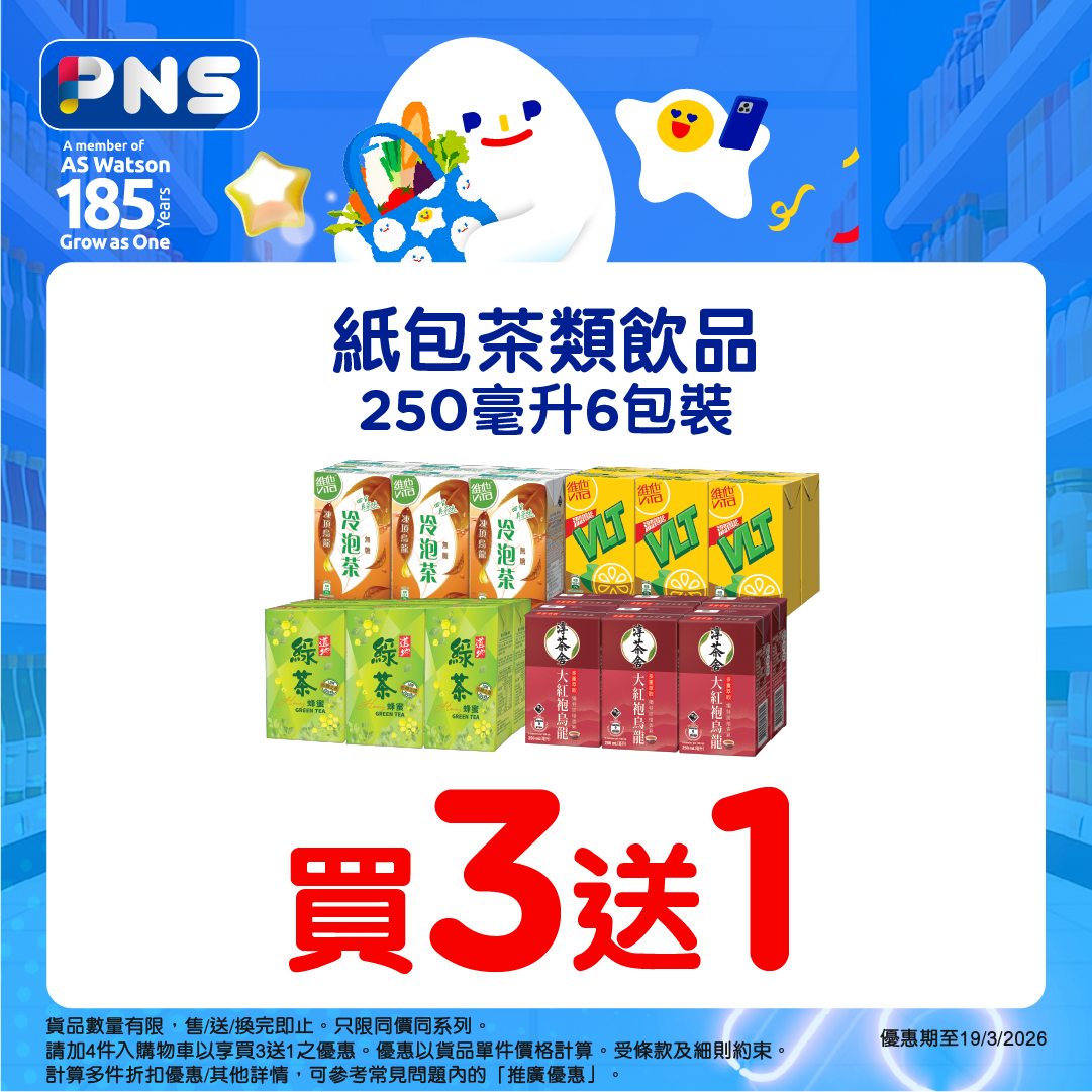 買2箱9折優惠期至2026年3月19日。紙包茶類飲品優惠適用於有售賣此貨品之香港百佳店舖及PNS網購。其他優惠只適用於PNS網購。需登入PNS網購以查看贈品優惠。贈品數量有限,送完即止。優惠以每張訂單計算。圖片只供參考。受條款及細則約束。