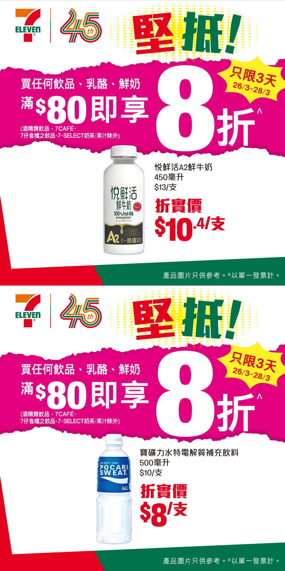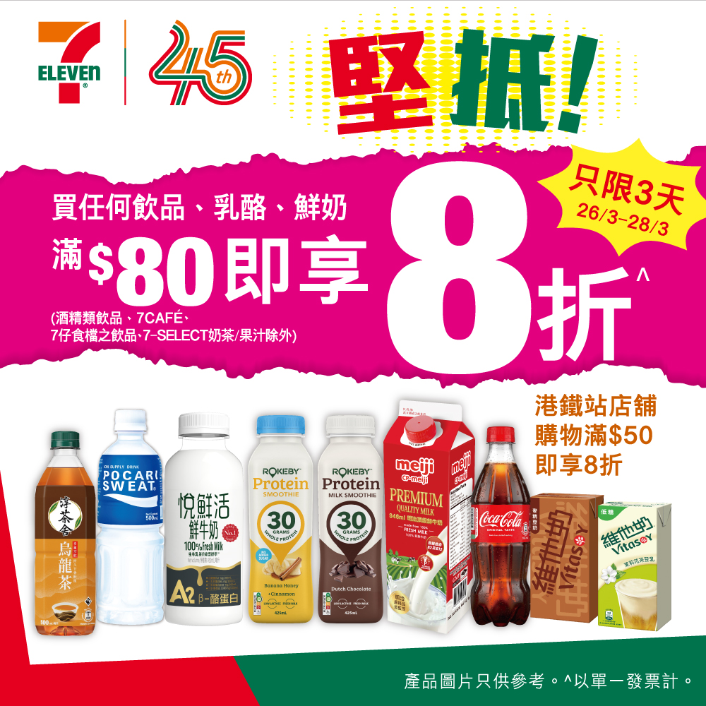 *優惠有效期由2026年3月26日早上7時至3月28日。以單一交易計算。部分貨品只限於指定店舖提供。貨品數量有限,售 / 送 / 換完即止。價格於香港店舖以港幣為單位,而於澳門店舖則以澳門幣為單位。 如有爭議,所有價格以個別店舖為準。貨品圖片只供參考。就一切有關事宜,7-Eleven 將保留最終之決定權。