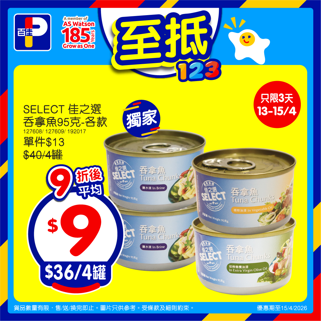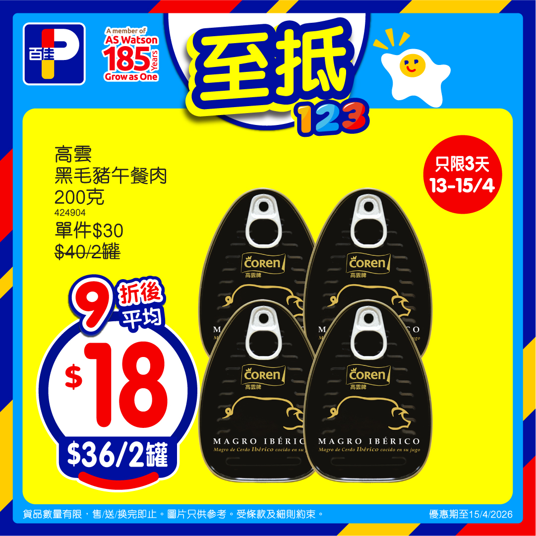 *優惠期至15/4/2026。以上優惠適用於大部分香港百佳、FUSION、TASTE、INTERNATIONAL 及 PNS 網購有售,並不適用於百佳旗下的其他超市品牌、百佳快閃特賣埸。貨品數量有限,售/送/換完即止。圖片只供參考。受條款及細則約束。以每張發票計算。