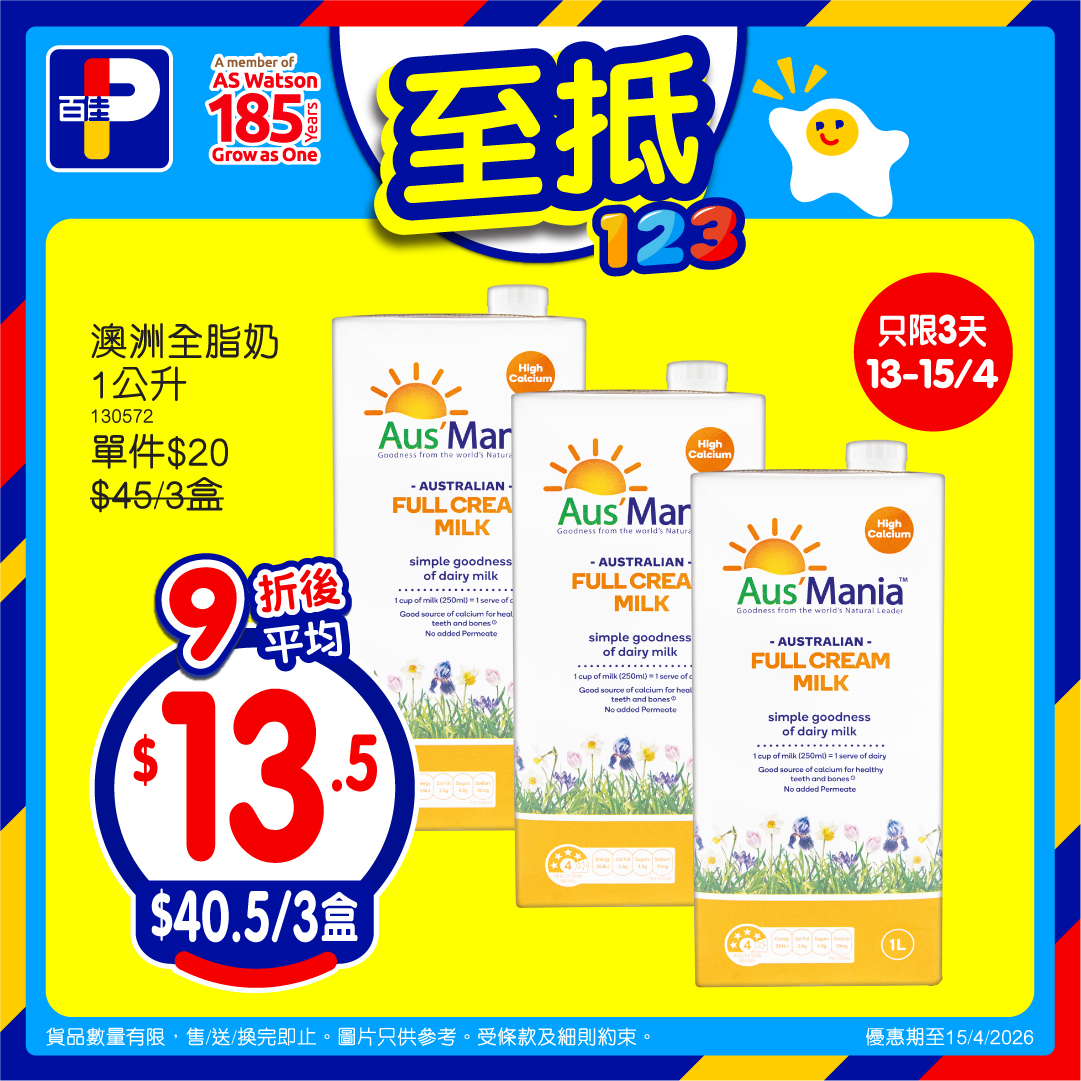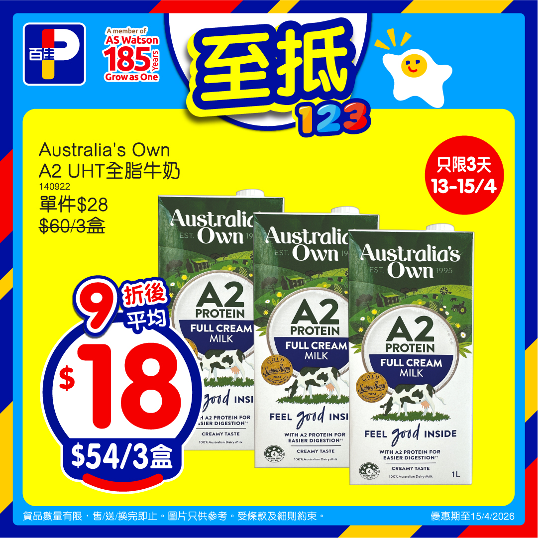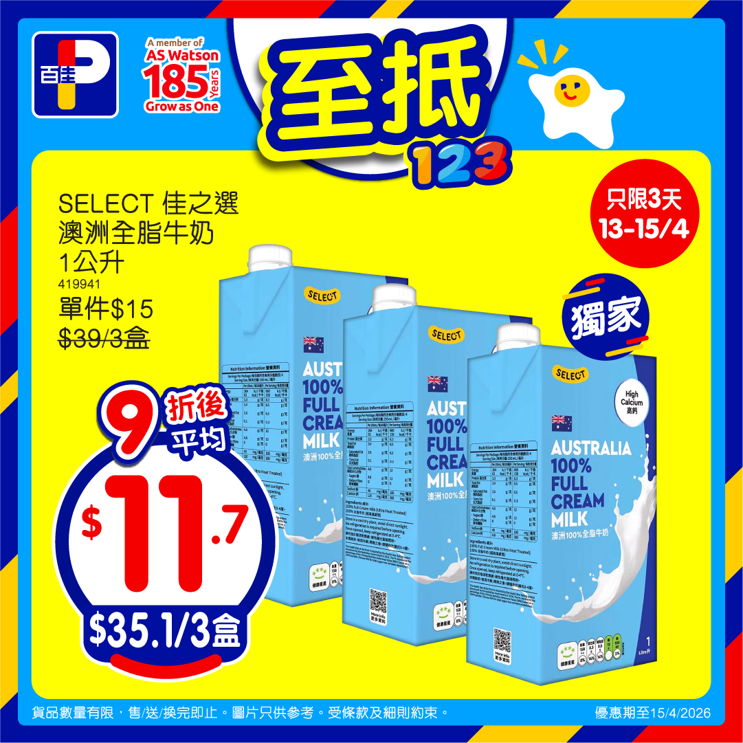 *優惠期至15/4/2026。以上優惠適用於大部分香港百佳、FUSION、TASTE、INTERNATIONAL 及 PNS 網購有售,並不適用於百佳旗下的其他超市品牌、百佳快閃特賣埸。貨品數量有限,售/送/換完即止。圖片只供參考。受條款及細則約束。以每張發票計算。