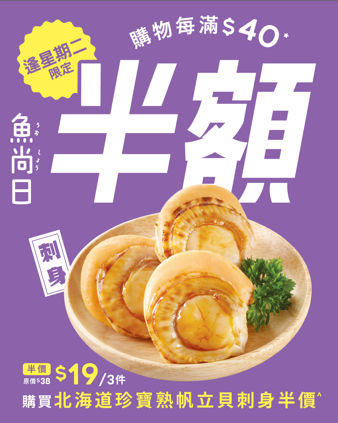 *以淨消費金額(不包括指定半價北海道珍寶熟帆立貝刺身)及單一收據計算。每滿$40*,可享 「魚尚日」優惠,購買最多2份半價北海道珍寶熟帆立貝刺身(3件)。^北海道珍寶熟帆立貝刺身以原價計算。此優惠不適用於青衣城、 沙田連城廣場及九龍灣德福廣場魚尚分店。數量有限,售完即止。