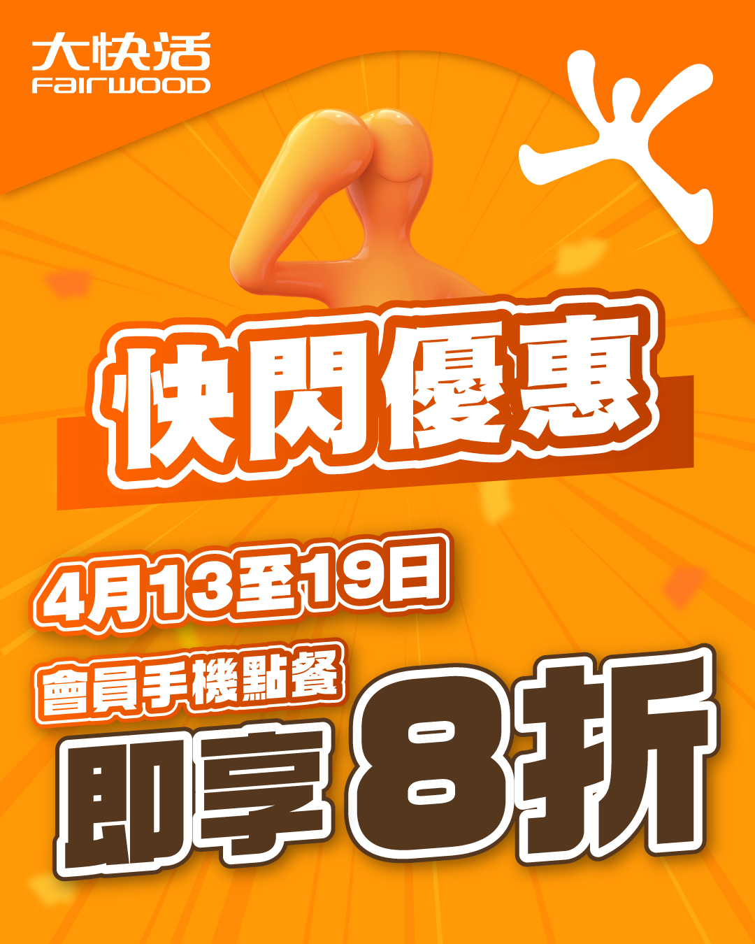 由即日至4月19日,只要你係大快活APP會員,用手機點餐就可享全單8折優惠!全線分店、任何時段都適用!