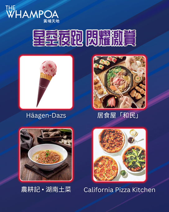 驚喜豈止於此?黃埔天地亦由4月24至27日在時尚坊地下為大家準備了《星空夜跑 Gear Up市集》,匯聚多元好物讓大家整裝待發;由即日起至5月1日更有《星空夜跑閃耀激賞》,廣大市民於多間參與商戶惠顧即可享專屬優惠,而5月1日當天,加插參加選手出示號碼布即享額外禮遇,務求讓每一位參加者滿載而歸!