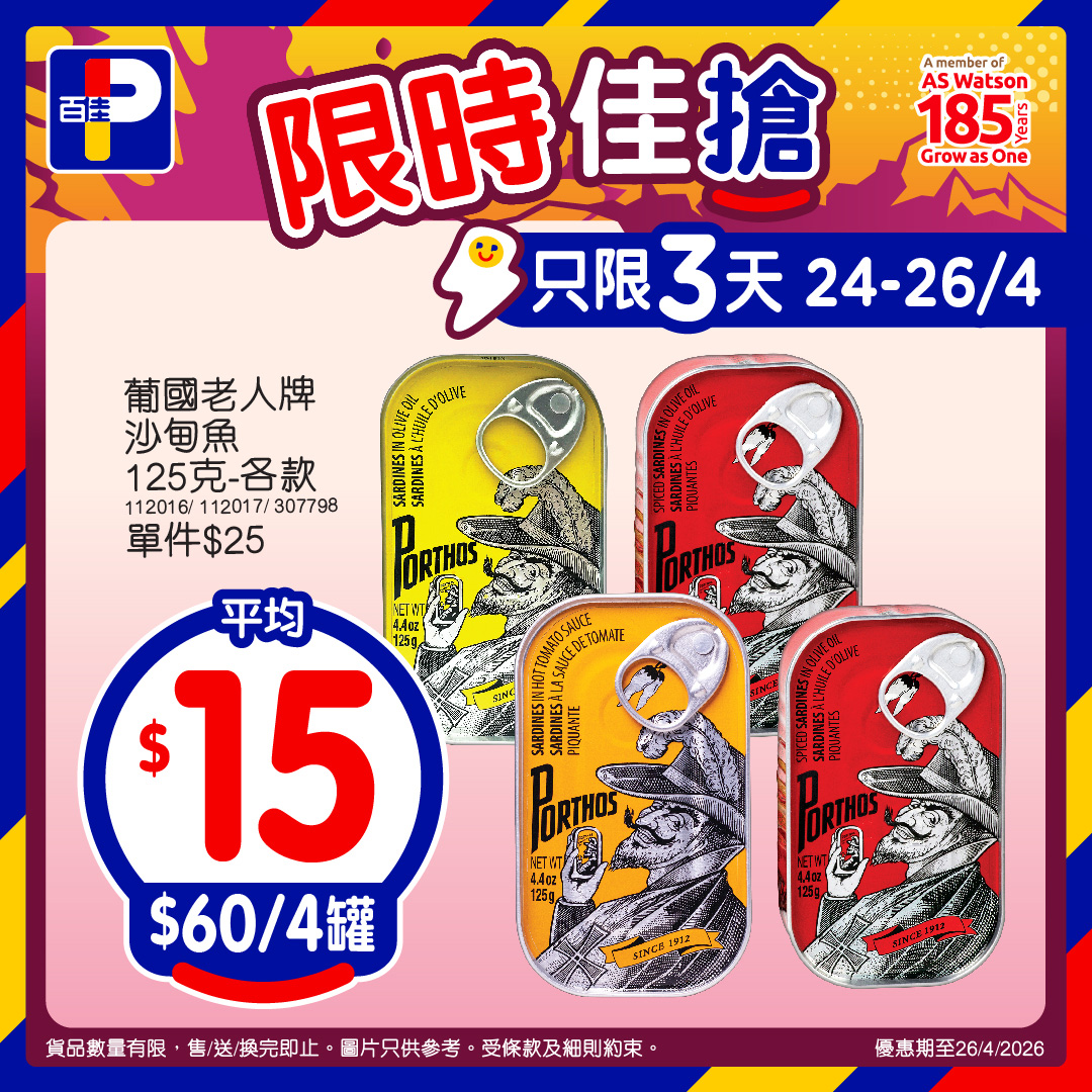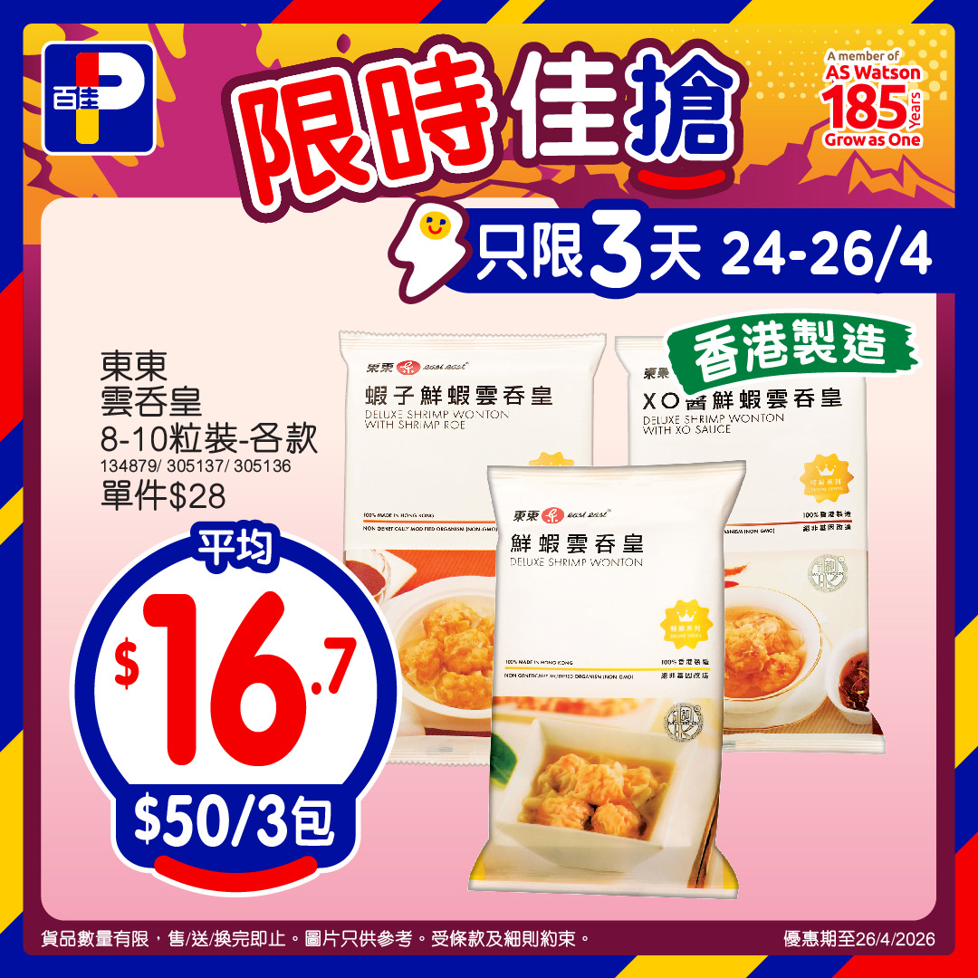 *優惠期至26/4/2026,以上優惠適用於大部分香港百佳、FUSION、TASTE、INTERNATIONAL及PNS網購有售,並不適用於百佳旗下的其他超市品牌及百佳快閃特賣埸。貨品數量有限,售/送/換完即止。圖片只供參考。 受條款及細則約束。贈品/換購品除外。以每張發票計算。