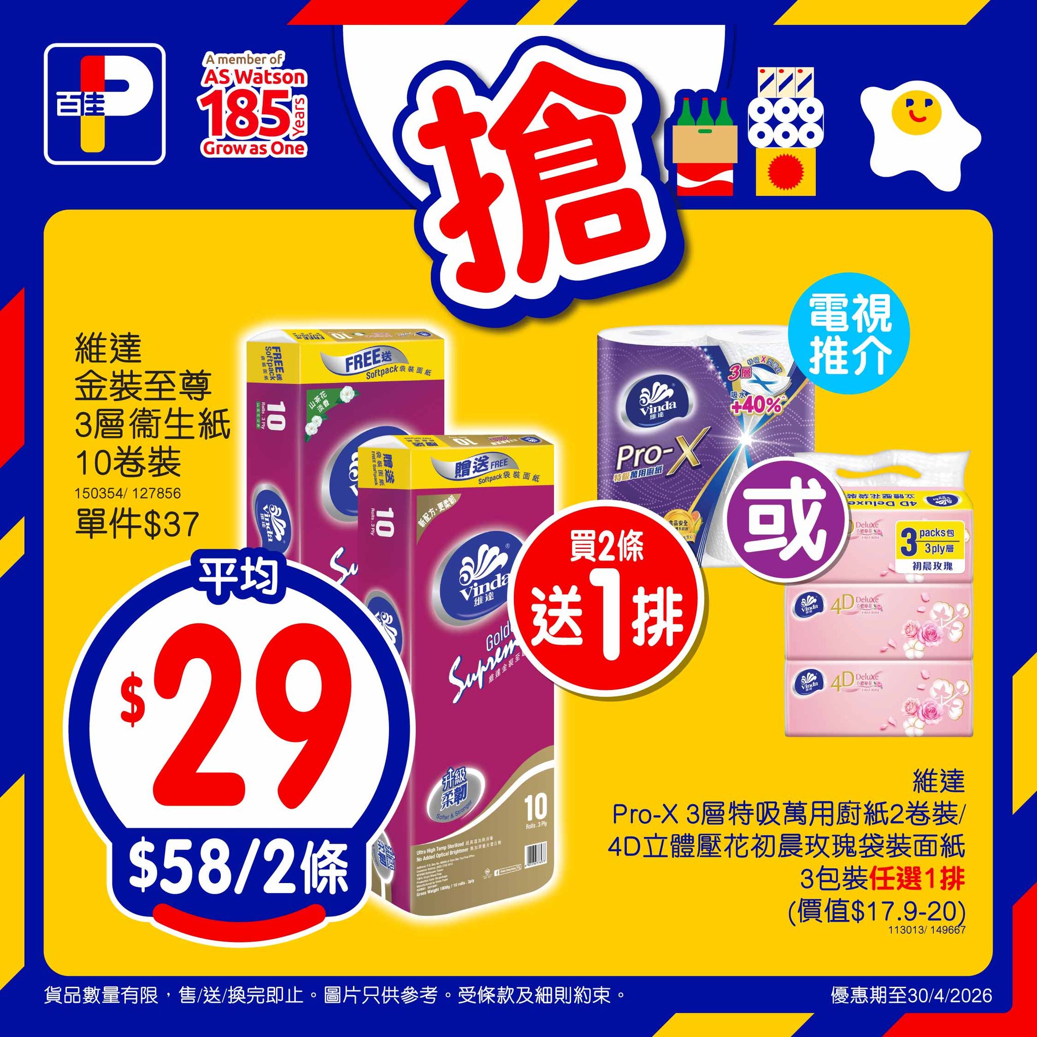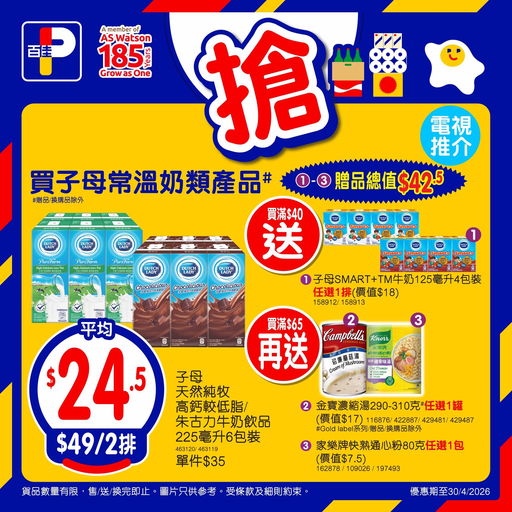 *優惠至30/4/2026。以上優惠適用於大部分香港百佳、FUSION、TASTE、INTERNATIONAL 有售,並不適用於百佳旗下的其他超市品牌、百佳快閃特賣埸及新鮮食品優惠並不適用於 TASTE x FRESH 新鮮生活之店舖。貨品數量有限,售/送/換完即止。圖片只供參考。受條款及細則約束。以每張發票計算。 # 原箱優惠除外
