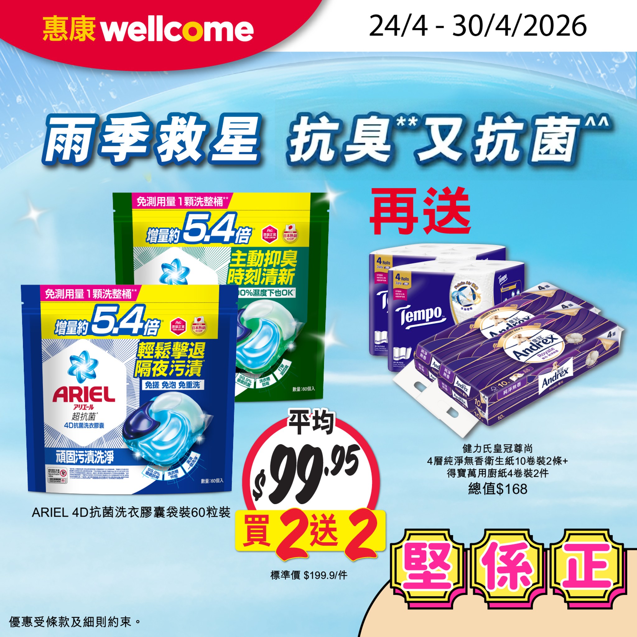 ARIEL 洗衣膠囊60粒裝 買2送2,平均$99.95 /件,再送健力氏皇冠尊尚4層純淨無香衛生紙10卷裝2條及得寶萬用廚紙4卷裝2件,總值$168優惠期:24/4 - 30/4/2026