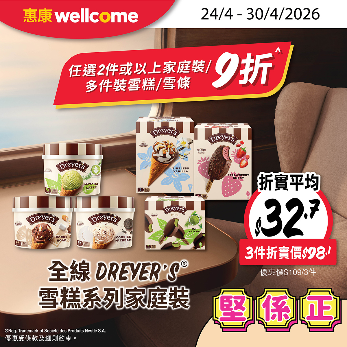 部分優惠適用於惠康網店/Market Place網店/yuu網購。以單一發票及折實價計算。貨品/ /贈品數量有限,送/售完即止 。部分貨品只限指定分店提供。優惠受條款及細則約束。貨品圖片只供參考。
