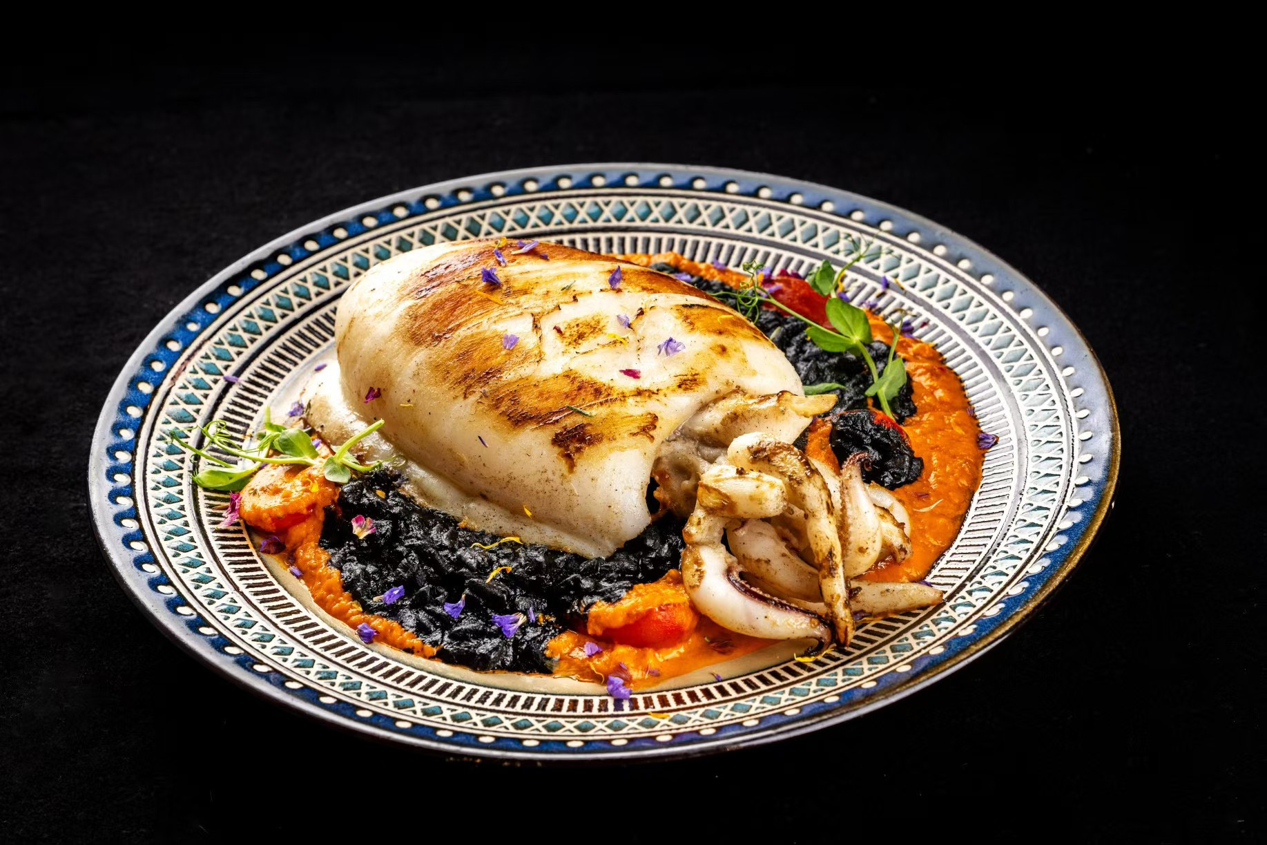 原隻墨魚從西班牙空運到港,肉質爽口鮮甜,與冷凍處理的墨魚截然不同。以炭烤手法突顯其天然鮮味,配以墨魚汁意大利飯吸收精華,再佐以法式燴蕃茄,層次豐盈。