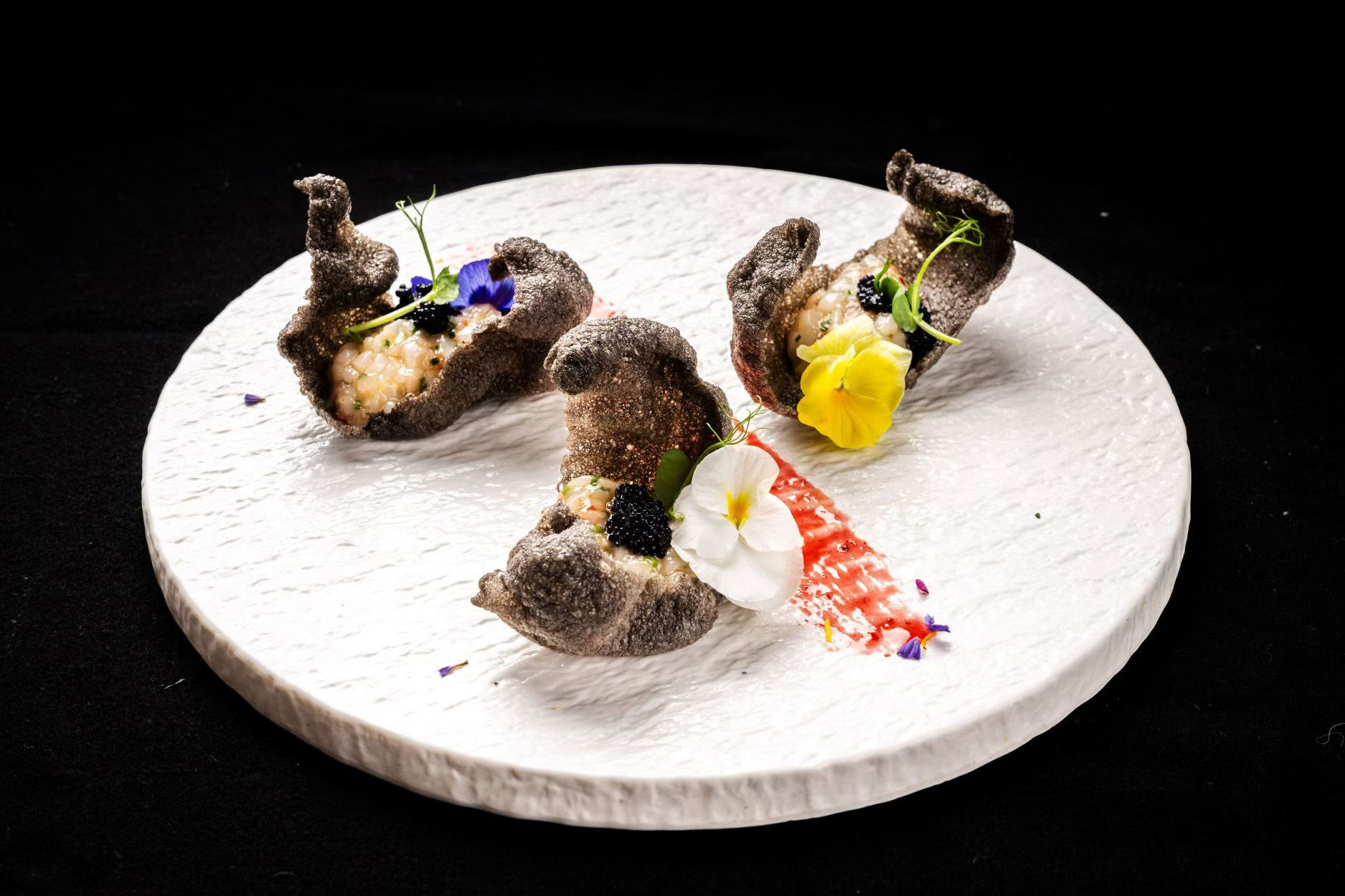 西班牙紅蝦他他 意大利魚子醬 墨魚脆片配辣筋油醋汁 (3件)