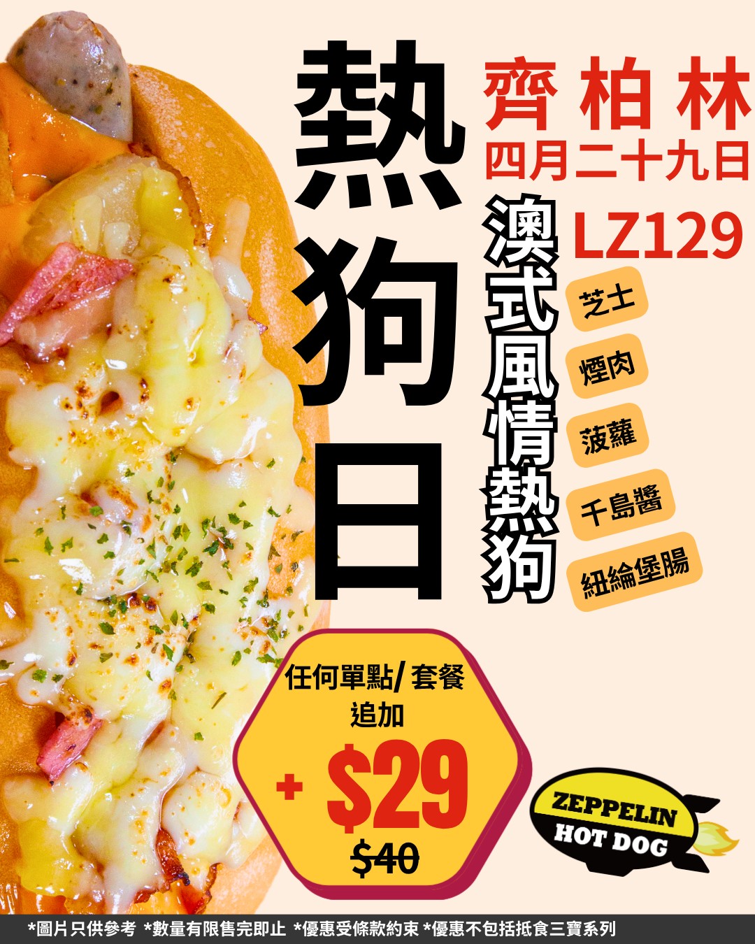 四月二十九,嚟食LZ129齊柏林熱狗日單日限定優惠:任何單點或套餐,只需 +$29 即可換購皇牌【澳式風情熱狗】一隻 (原價 $40)!將港式夏威夷 Pizza 嘅靈魂,注入熱狗嘅身體。菠蘿配熱狗,好食到連意大利人都 Kur 晒!人見人愛,車見車載,你都快D嚟帶佢走啦喂?-#熱狗日 #齊柏林 #ZEPPELIN #優惠 #澳式風情熱狗