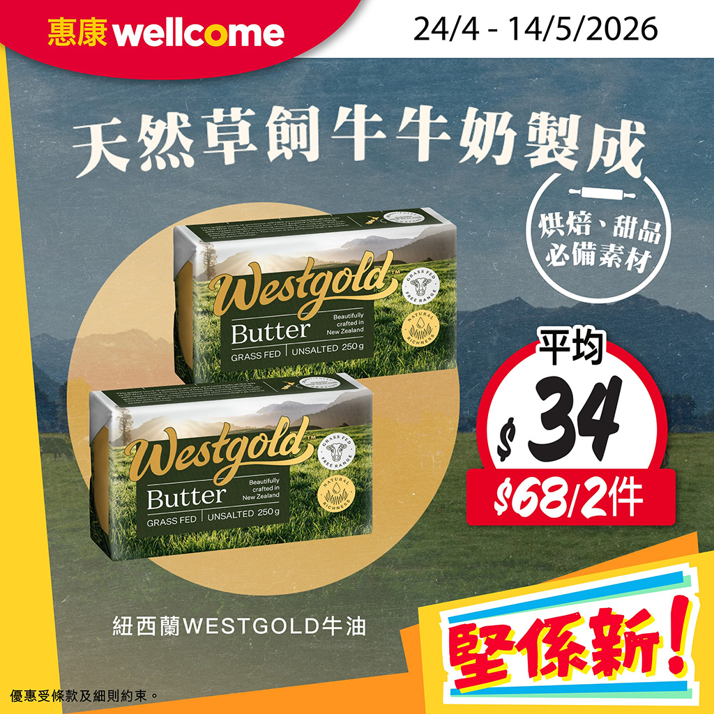 紐西蘭Westgold牛油 優惠價$68/2件**,平均$34/件由草飼牛奶製造,天然香濃,係烘焙、甜品必備素材!